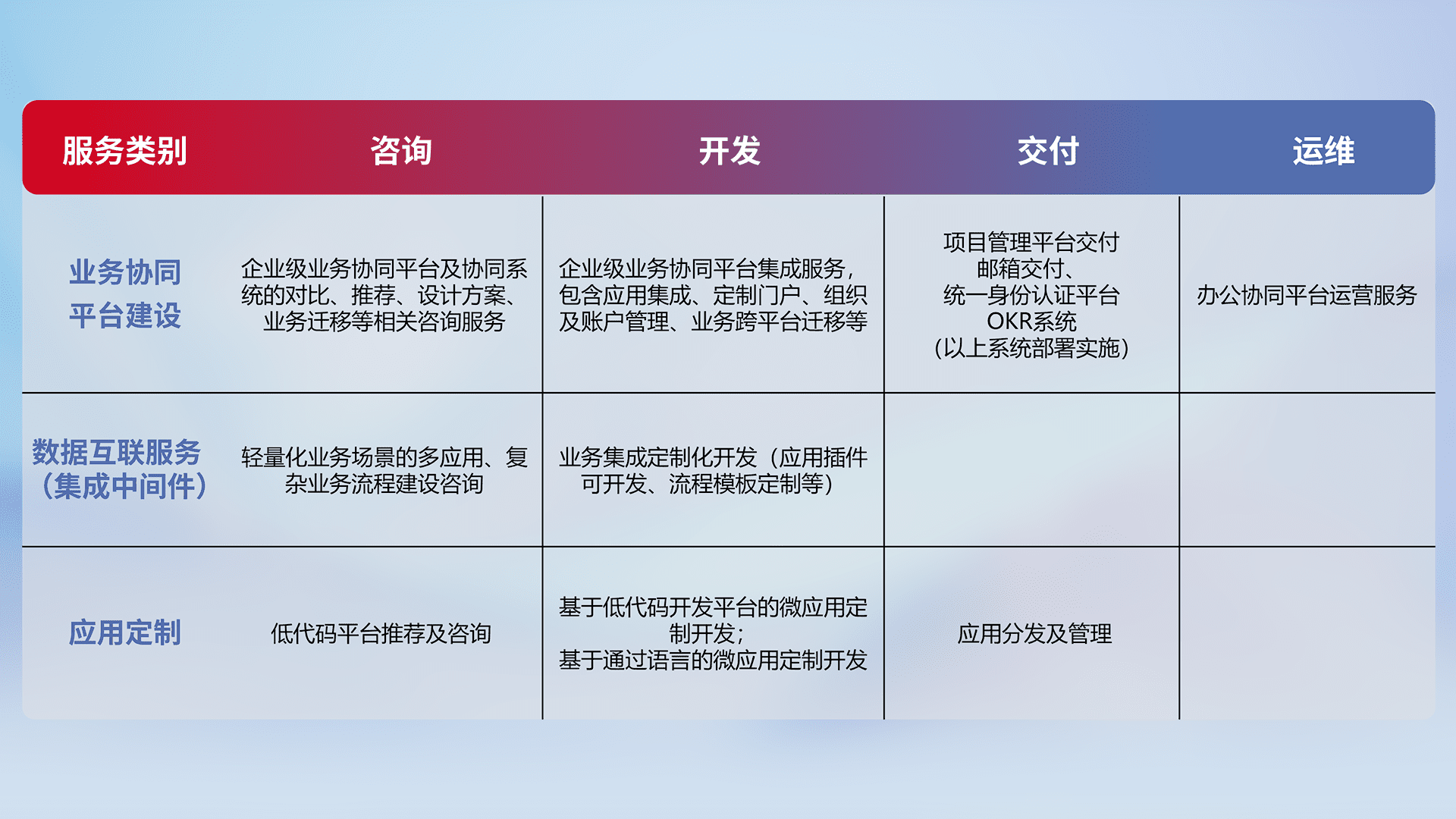 针对钉钉、、、企微、、、IDaas等平台级产品提供产品的规划、、、、方案、、、交付、、定制化开发等服务,,,实现如统一协同办公、、智能客户服务、、、、混合会议管理、、、、智能数据查询、、、等业务场景,,实现数字化转型。。。